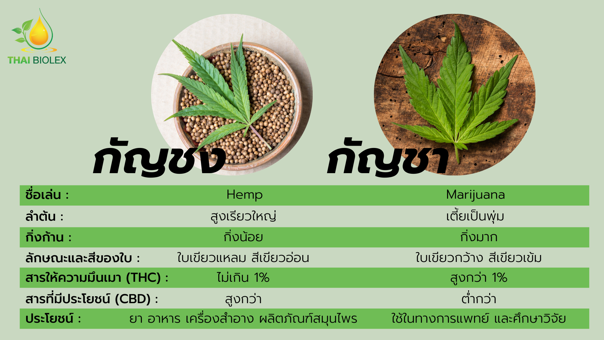 กัญชง (Cannabis sativa) เป็นพืชในตระกูล Cannabaceae บางครั้งหลายคนก็ยังมีความสับสนระหว่างกัญชงกับต้นกัญชาที่ใช้ในทางการแพทย์และกัญชาที่เป็นสารเสพติด แม้ว่าผลิตภัณฑ์ทั้งกัญชงและกัญชา มีสาร THC ซึ่งเป็นสารประกอบที่ส่งผลทางจิตประสาท เมื่อเทียบกันแล้ว กัญชงมี THC เพียงเล็กน้อยเมื่อเทียบกัญชา